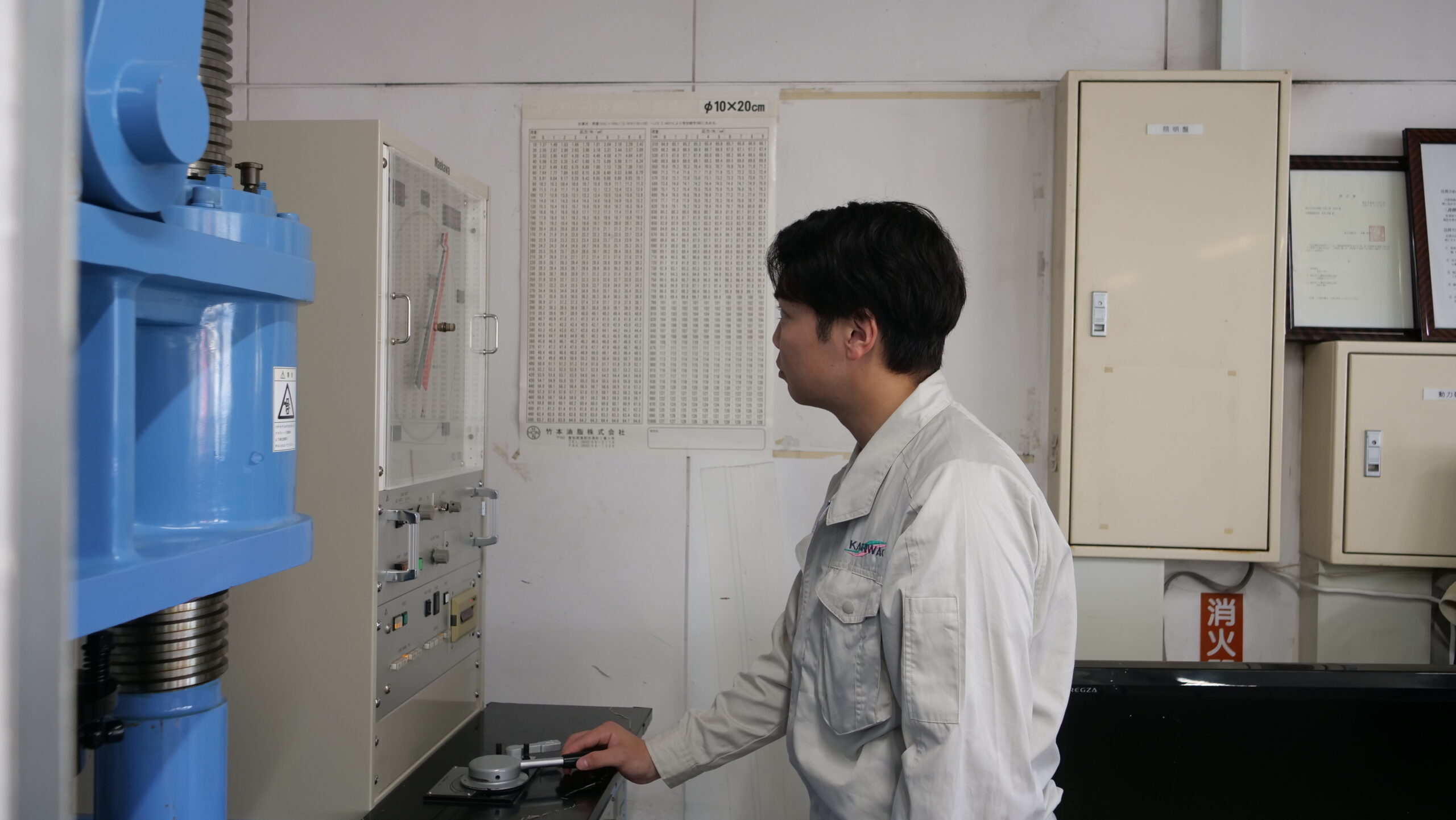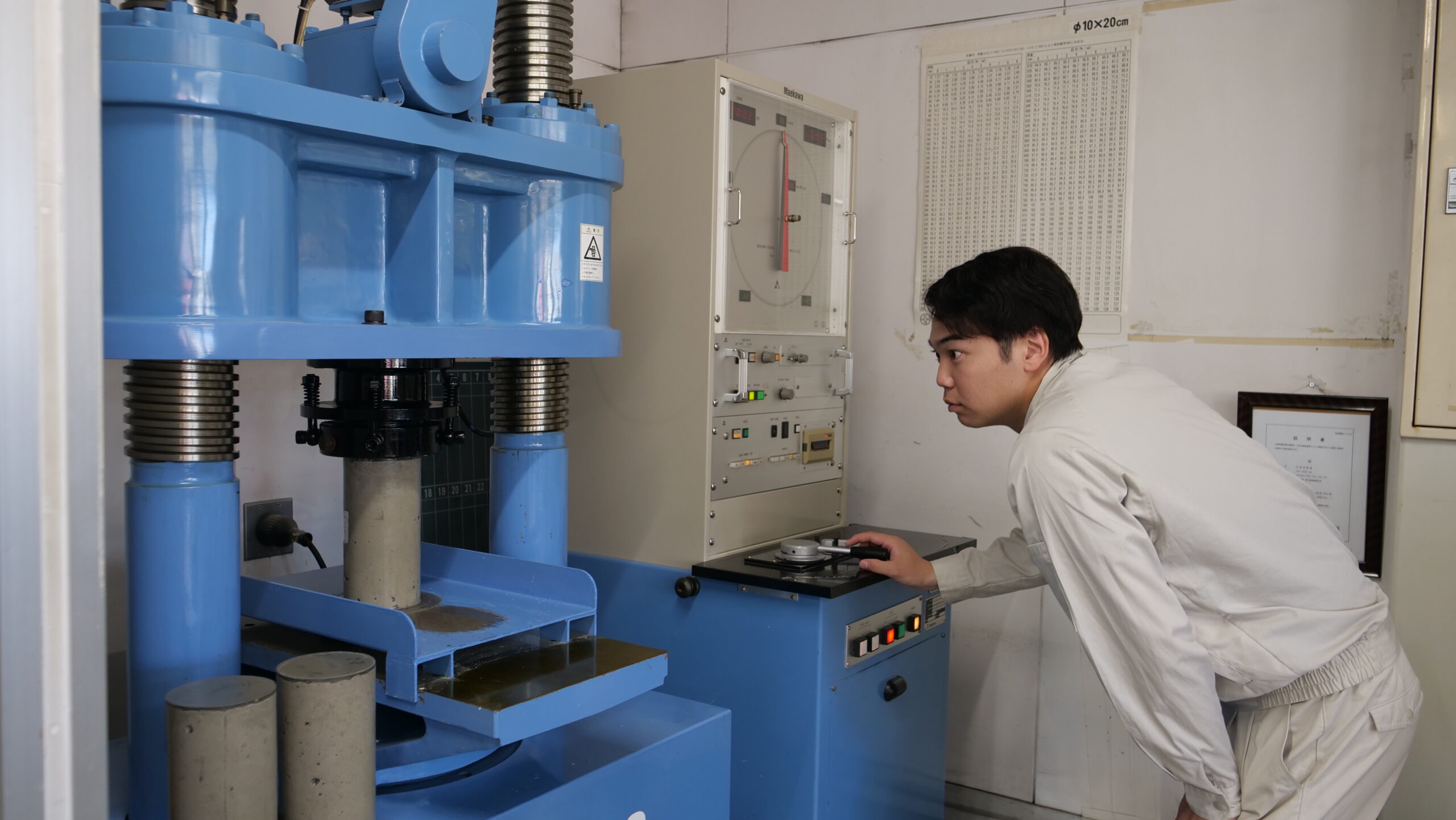 入社後の3ヶ月間は研修期間として3つの工場を回り、現在は神田工場で生コンクリートの品質に関する試験業務を担当しています。コンクリートの柔らかさや空気量などが規定の範囲内にあるかを確認する、建物の品質を左右する重要な仕事です。