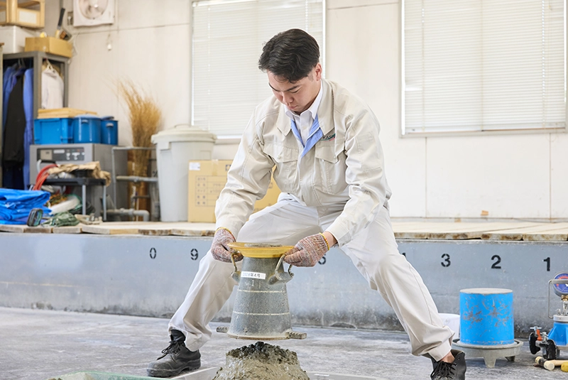 柏木興産の品質を守る最後の砦。JIS規格に基づき、生コンや製品が規定の強度や性能を満たしているかを、様々な試験を通じて検証します。なぜ強度が足りないのか、なぜひび割れが起きるのか、その原因を科学的に探求する仕事です。「私たちの品質が、社会の安全を支えている」という誇りが原動力です。